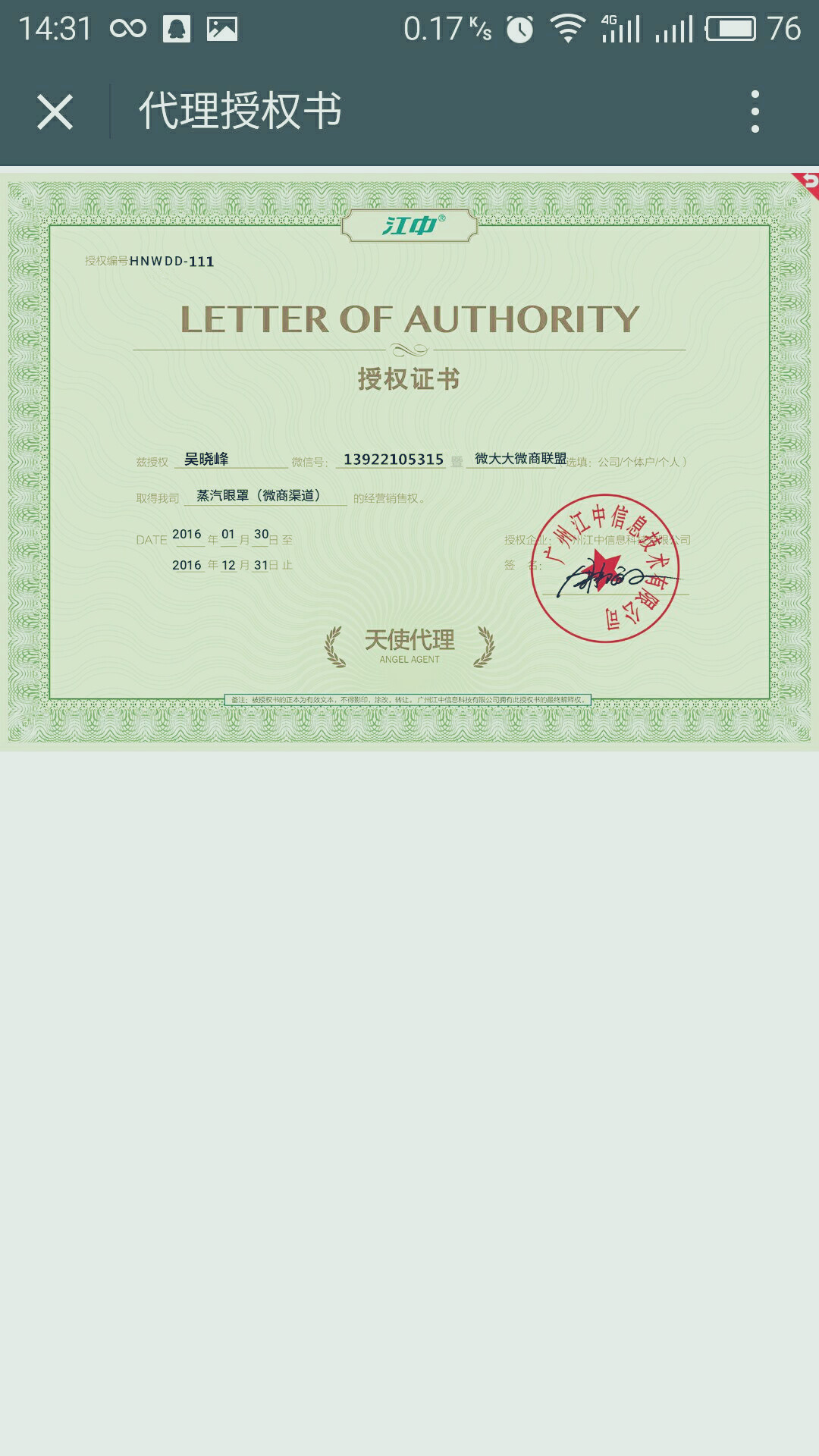 四、代理商授权证书