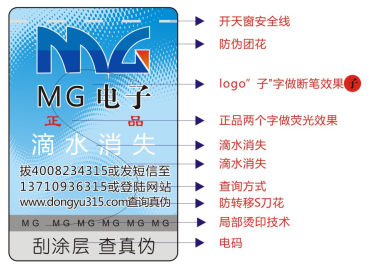 采用防伪技术等级中最高的人民币开窗安全线,使用的纸张由印钞造纸厂专版订购,本技术类同于新版人民币的开窗安全线,这种安全线一半埋在纸里,一半露在外面,可直接抽出,安全线中还有镭射变色的字母,提高了仿冒的难度;本标识也采用了橙红色防复制荧光安全油墨印制,比普通油墨色彩艳丽,荧光灯下检验橙红色油墨发亮;另外本标识还采用了目前主流的数码防伪和复合式印钞团花的防伪技术,标识整体安全技术性高,仿冒难度极大,广泛适用于食品、药品、化妆品、服装服饰、电子电器等。